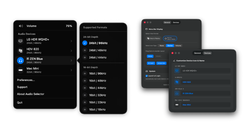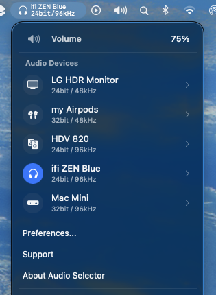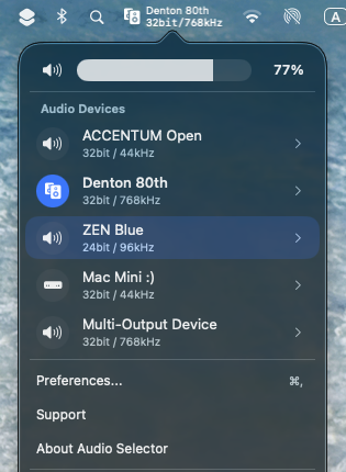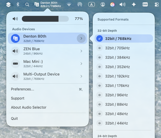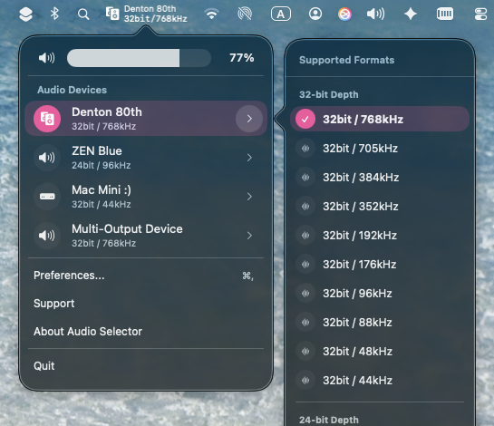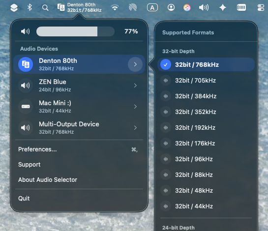 Switch audio devices and formats like 32-bit / 768kHz instantly from the menu bar. No more digging through System Settings or MIDI setups.