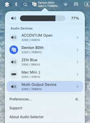 Switch between audio output devices in a single click, right from your macOS menu bar. Fast, minimal, and effortless.